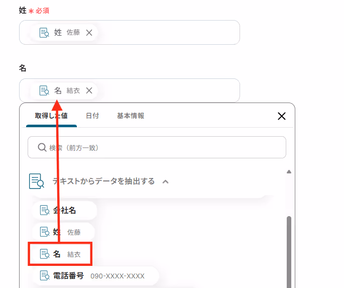 以下の画像のように、「テキストからデータを抽出する」アクションの取得した値から、抽出した項目をクリックすることで簡単に入力することができます。