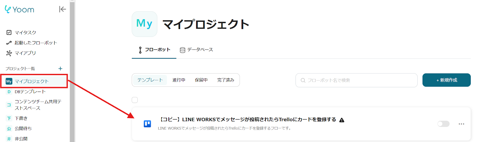 ここからは、Yoomのテンプレート【LINE WORKSでメッセージが投稿されたらTrelloにカードを登録する】という連携フローを使って設定をしていきます。
