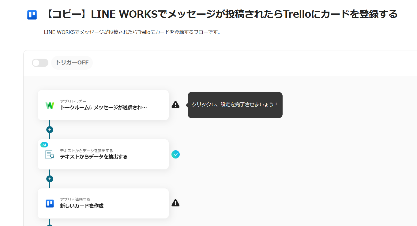 これで【LINE WORKSでメッセージが投稿されたらTrelloにカードを登録する】というフローが完成です。