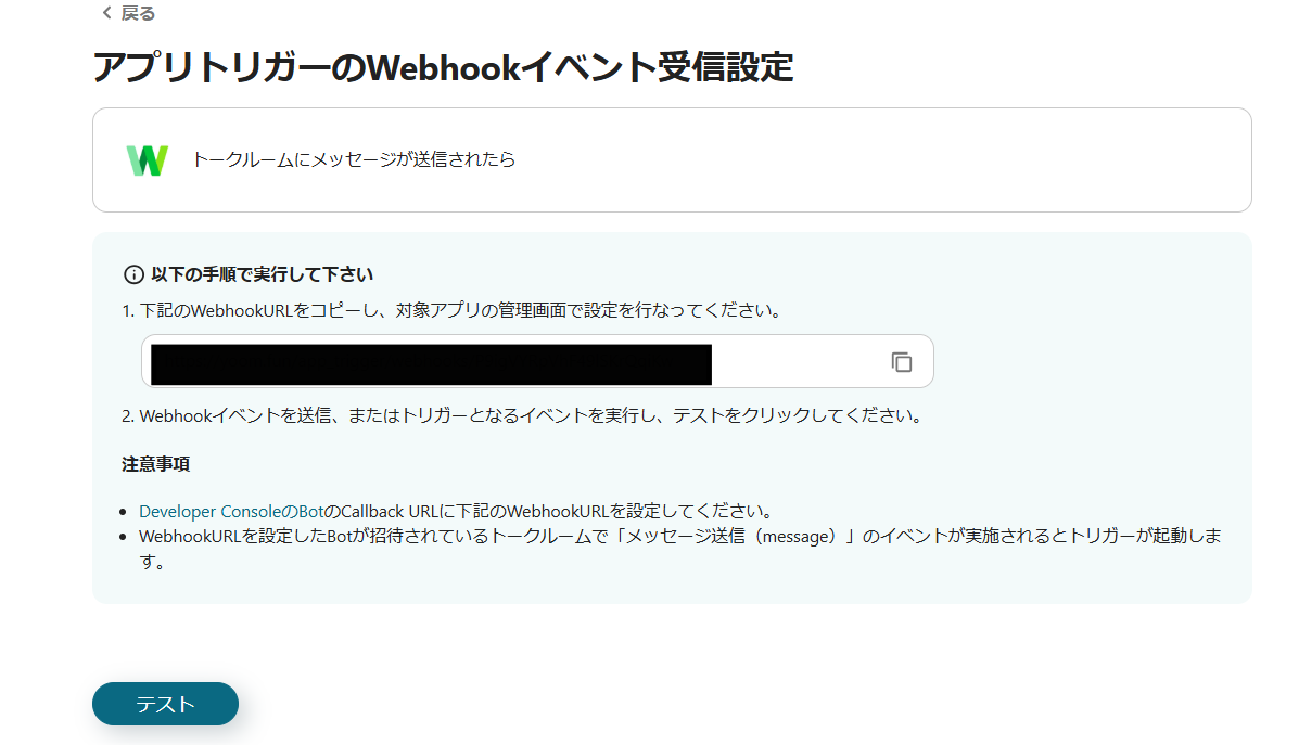 2) WebhookURLをコピーし、対象アプリの管理画面で設定を行なってください。