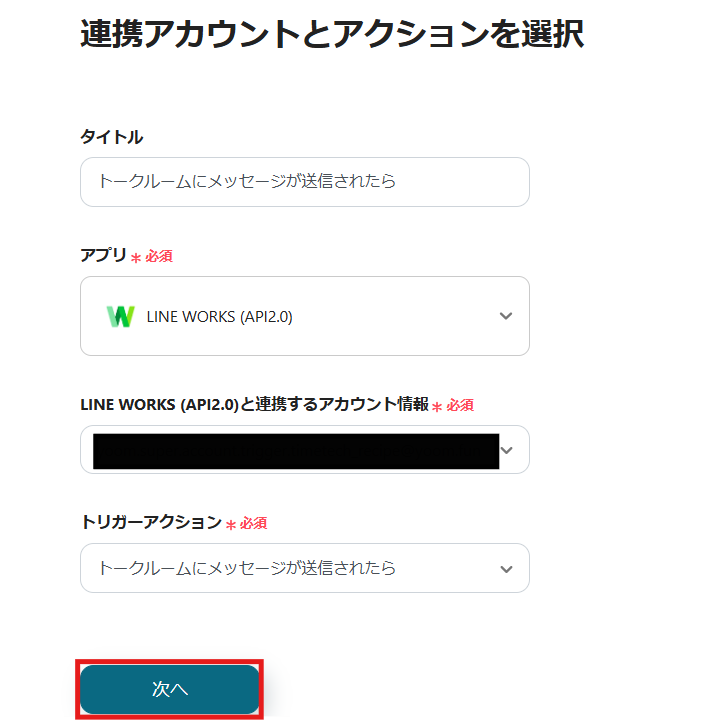 1) アクションは「トークルームにメッセージが送信されたら」を選択して、「次へ」をクリックします。