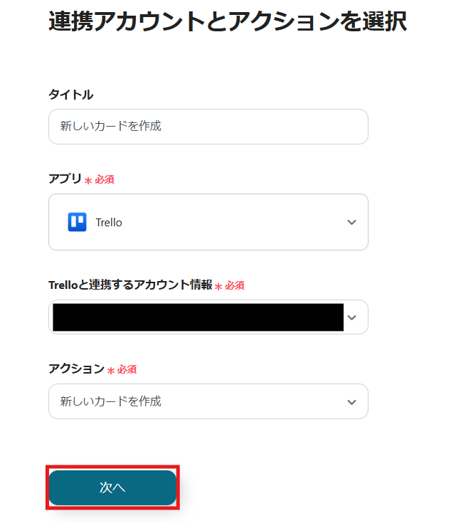 2) アクションは「新しいカードを作成」を選択し、「次へ」をクリックします。