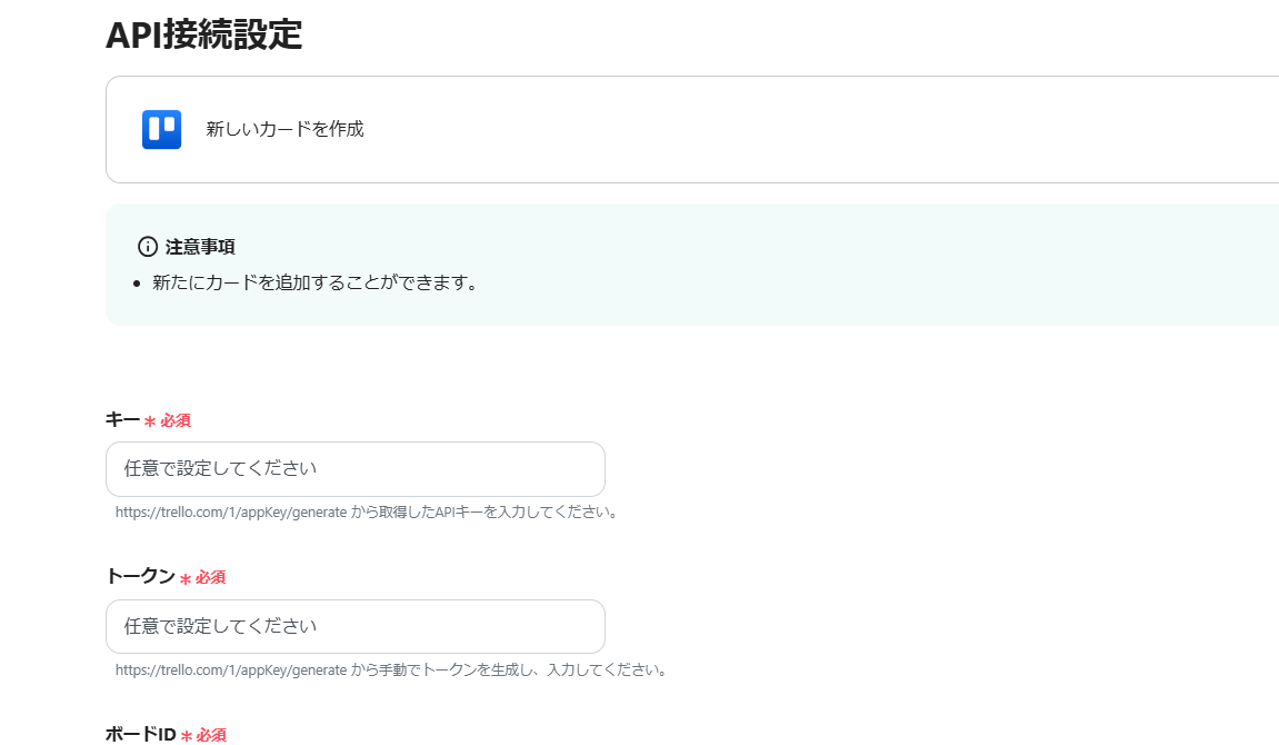 同様にTrelloを選択したら、あらかじめコピーしたトークンとAPIキーを登録します。