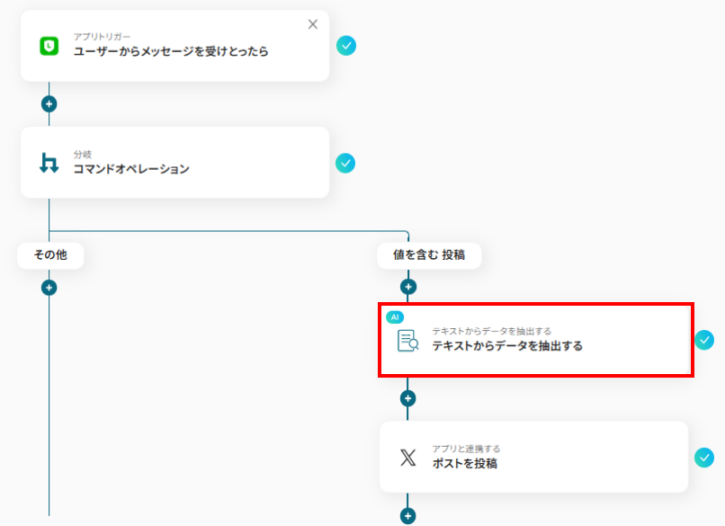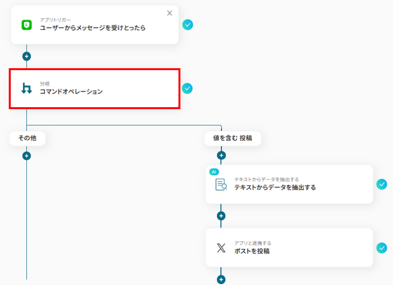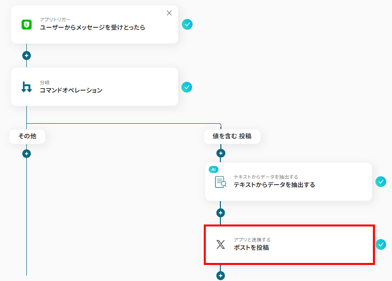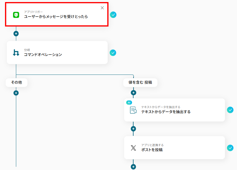 LINEで受信するメッセージの中から重要な情報を自動でX(Twitter)に発信したい方やSNS運用を効率化し、手動投稿の手間を省きたいSNS担当者の方におすすめのフローです。