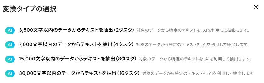 - 変換タイプ:4つのタイプから選択可能です。抽出したい文字数にあわせてご選択ください。