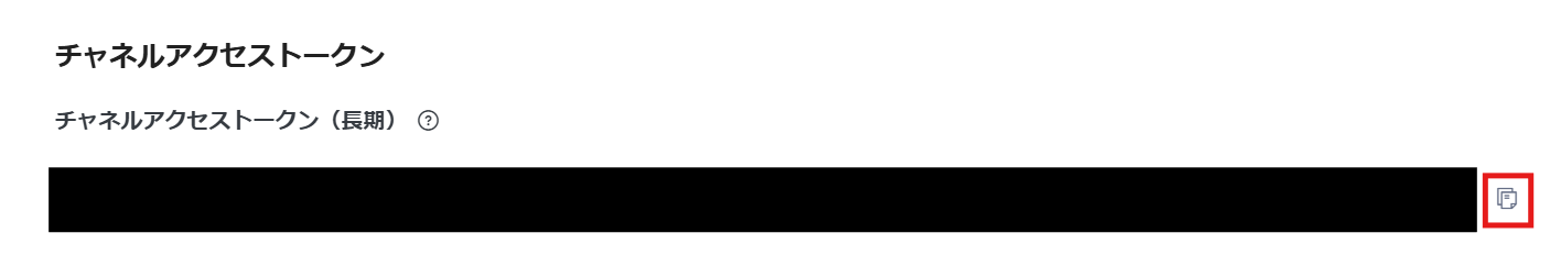 下にスクロールするとチャネルアクセストークン(長期)があるので、赤枠をクリックしてコピーして、Yoomの該当欄に入力しましょう。
