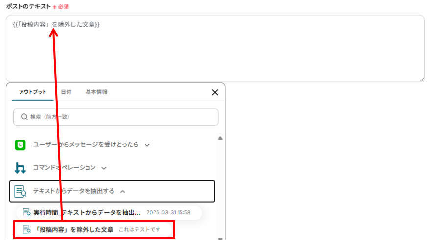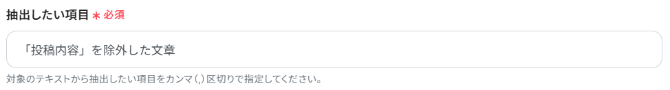 - 抽出したい項目:今回は「投稿内容」を除外した文章を抽出するよう設定しました。