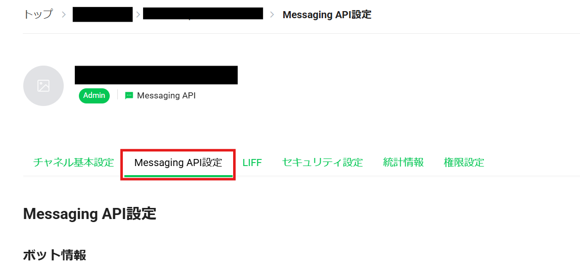 作成したチャネルを選択→Messaging APIと進みます。