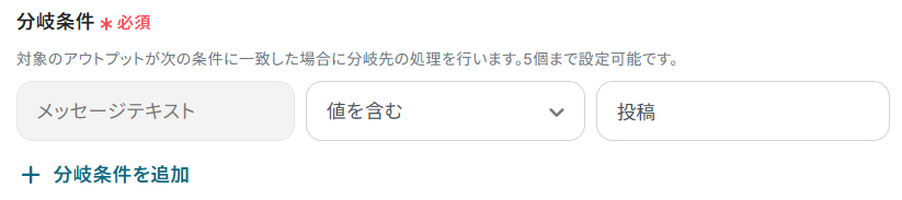 今回はLINEメッセージに「投稿」というキーワードが含まれた場合という内容で、下記画像のように設定しました。