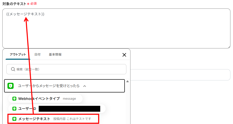 - 対象のテキスト:入力欄をクリックしますと下記のようにアウトプットが表示されます。今回はLINEのメッセージテキストを選択しました。