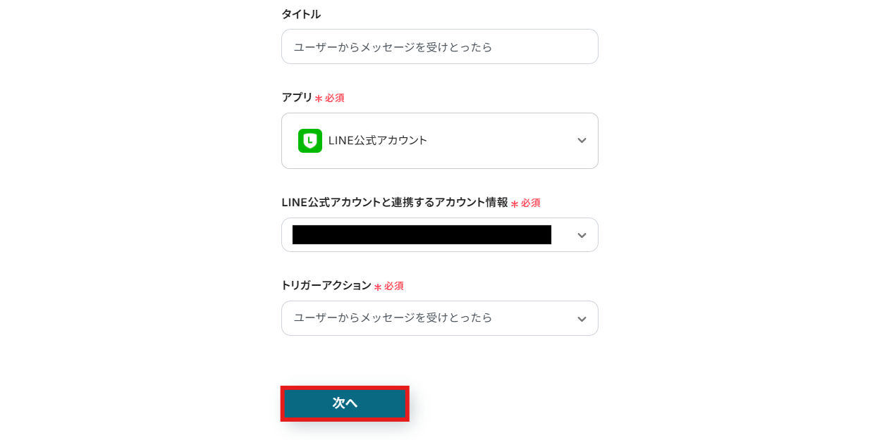 トリガーは「ユーザーからメッセージを受けとったら」を選択します。設定が終わったら「次へ」をクリックします。