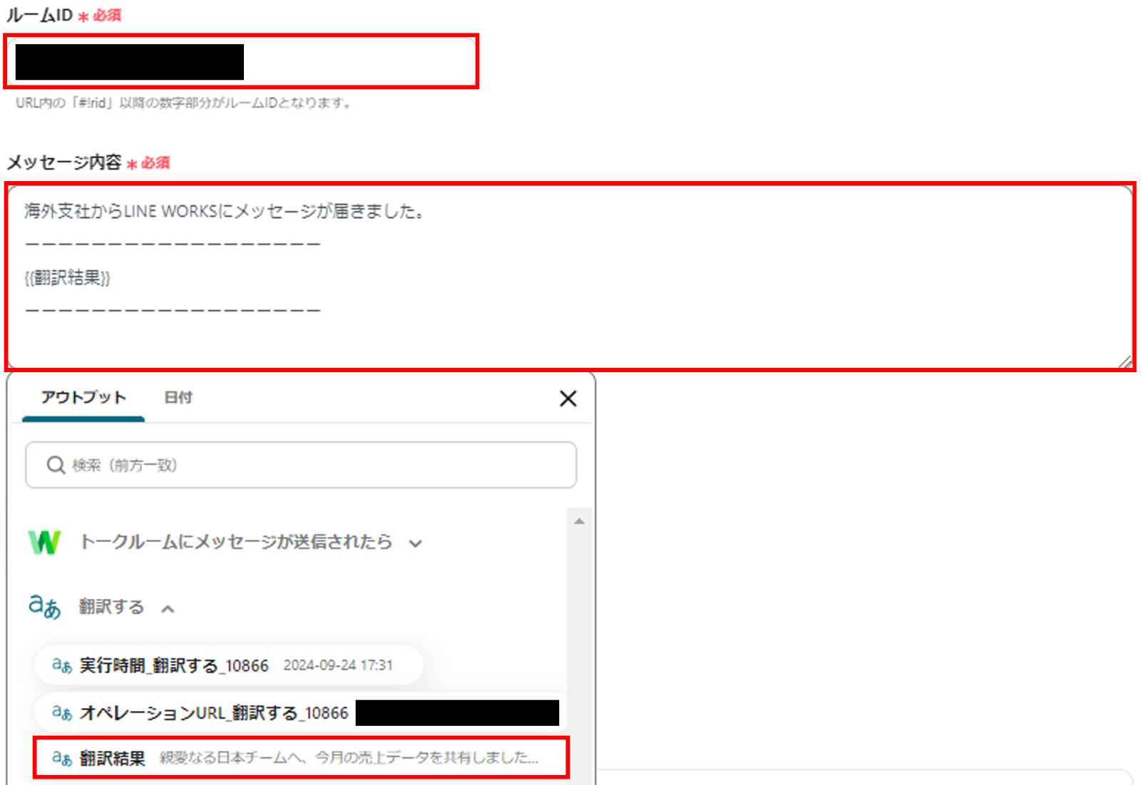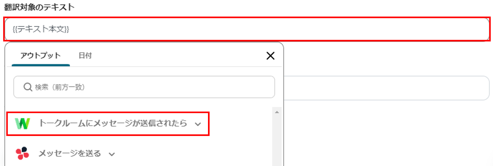 (3)詳細を設定画面で翻訳対象のテキストをアウトプットから選択します。