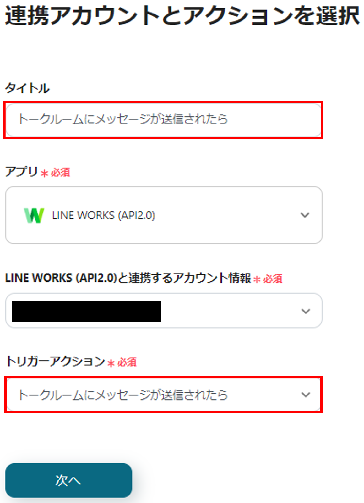 (2)アプリトリガーのタイトルを設定し、トリガーアクションに「トークルームにメッセージが送信されたら」が選択されていることを確認したら「次へ」をクリックします。