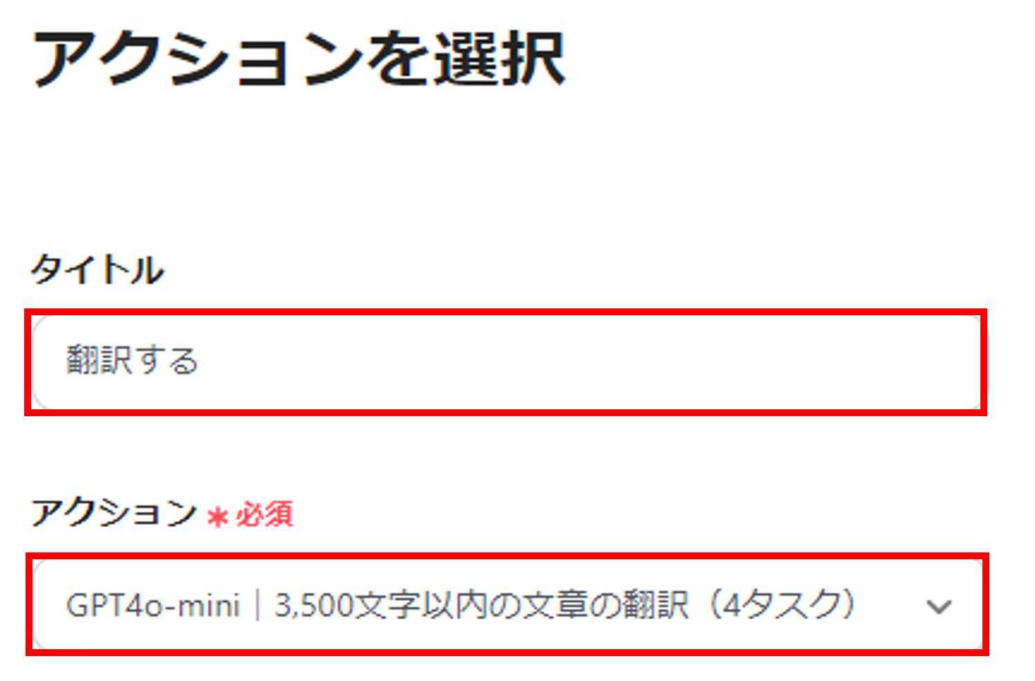 (2)タイトルを設定し、アクションは「GPT4o-mini|3,500文字以内の文章の翻訳(4タスク)」が選択されていることを確認したら「次へ」をクリックします。