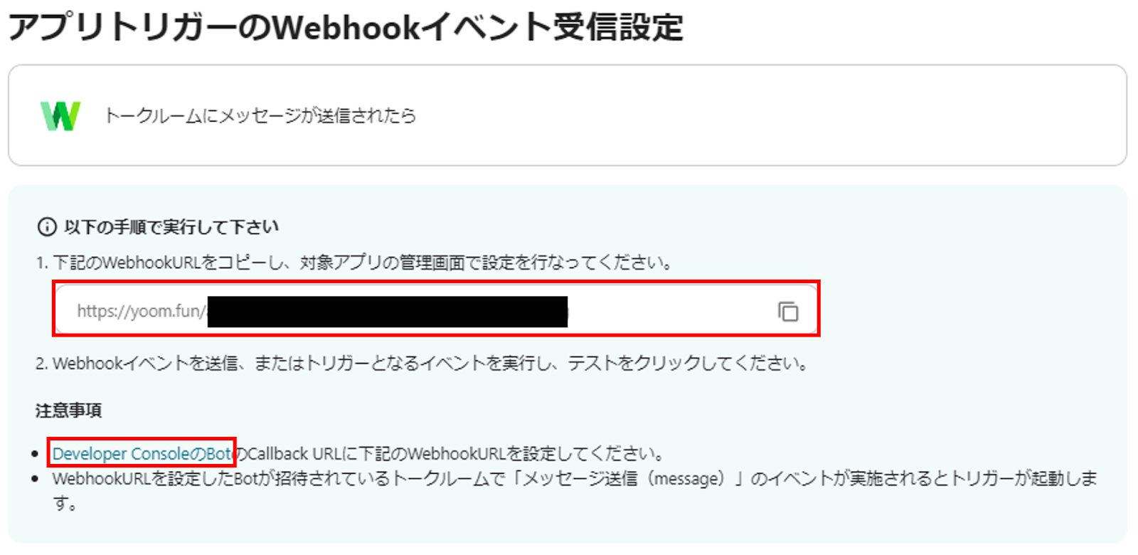 (3)アプリトリガーのWebhookイベント受信設定画面でWebhookURLをコピーして、Developer ConsoleのBotリンクをクリック