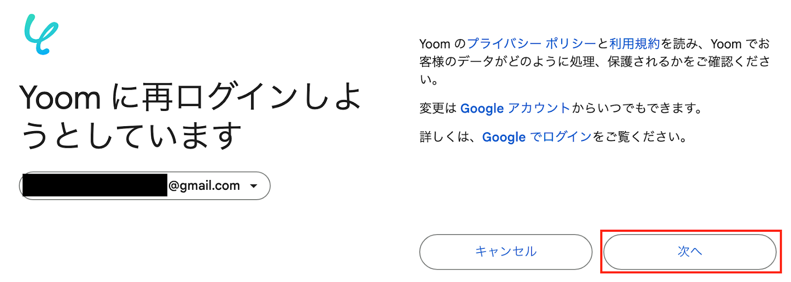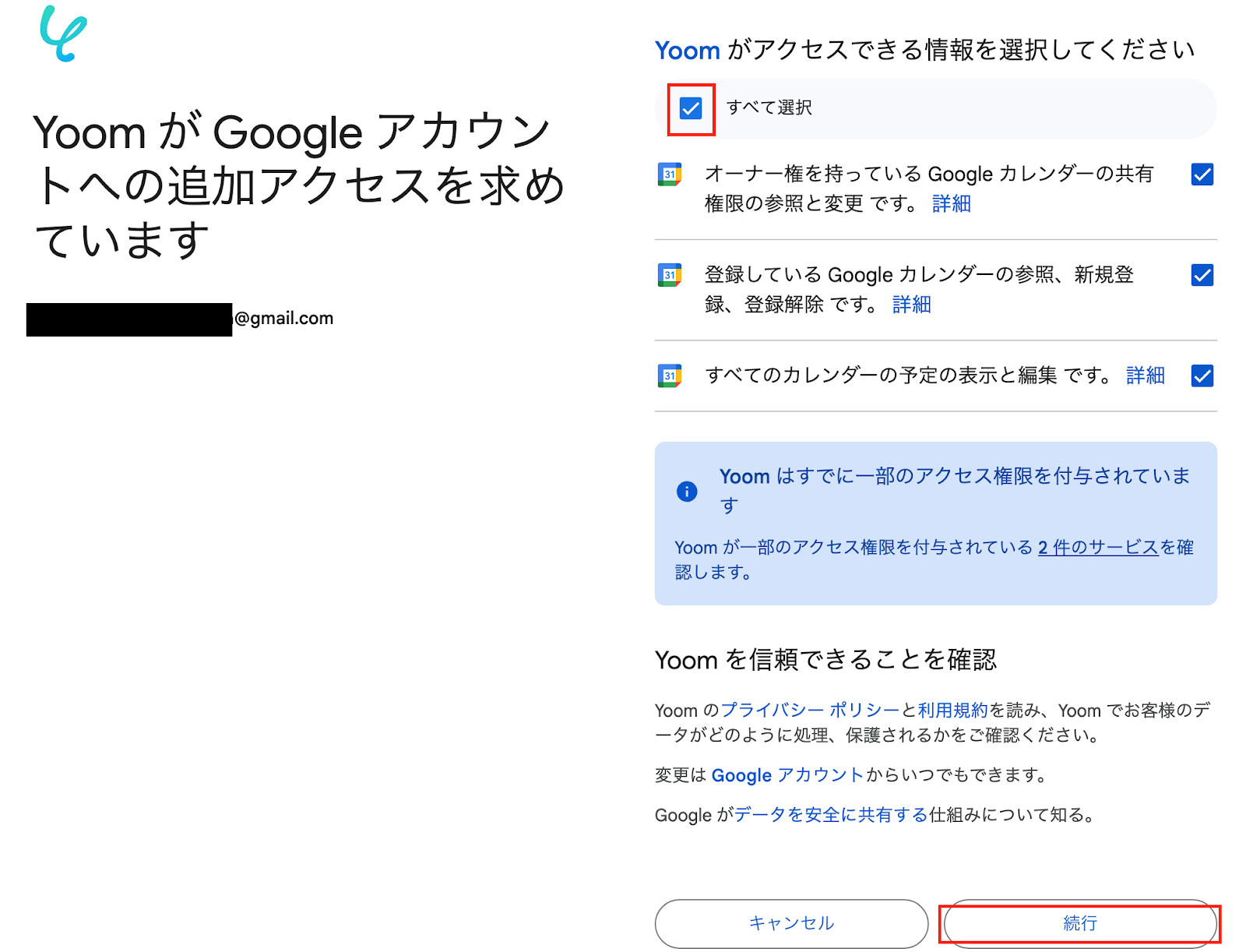 Yoomがアクセスできる情報の選択を求められるので、「すべて選択」をチェックし、「続行」ボタンを押しましょう。