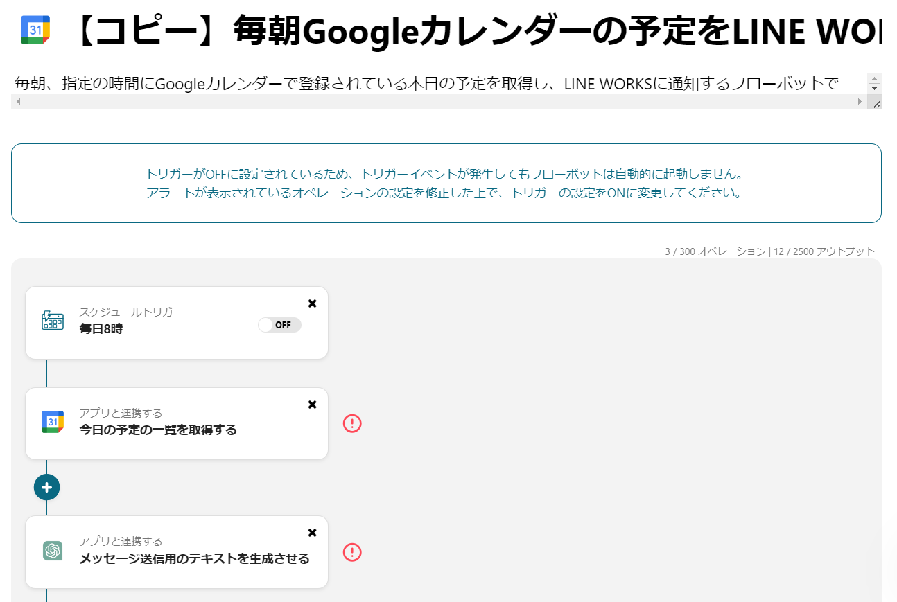 毎朝、指定の時間にGoogleカレンダーで登録されている本日の予定を取得し、LINE WORKSに通知するフローボットです。