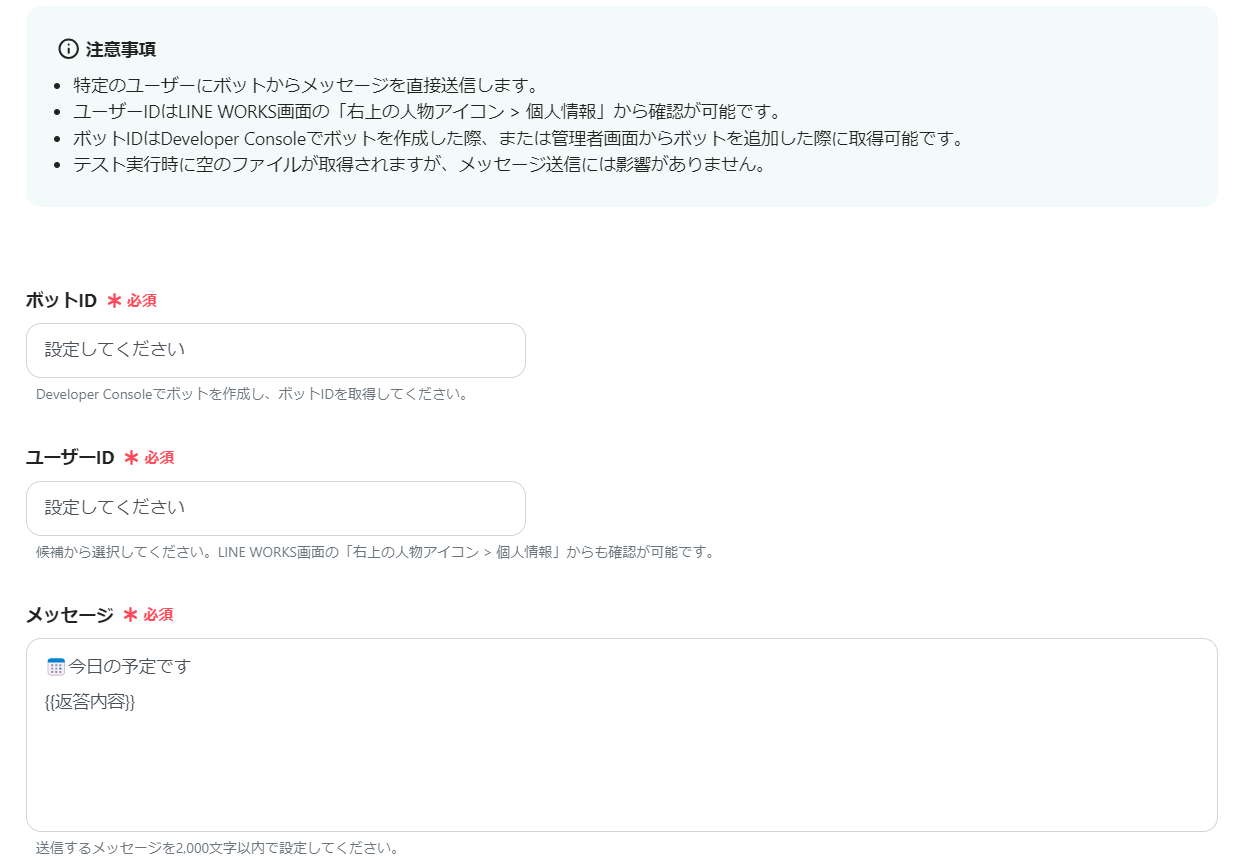 以下の画面に移行したら、「ボットID」と「ユーザーID」を設定します。