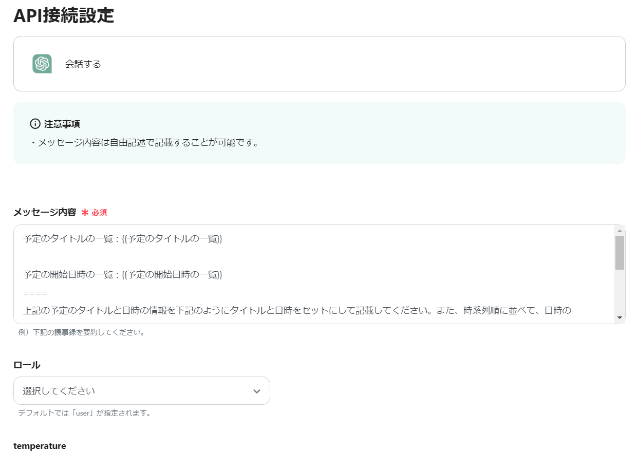 {{返答内容}}はアウトプットになるので、必ず入力してください。