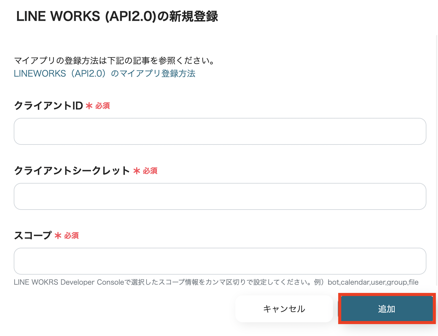「クライアントID」「クライアントシークレット」「スコープ」を入力します。