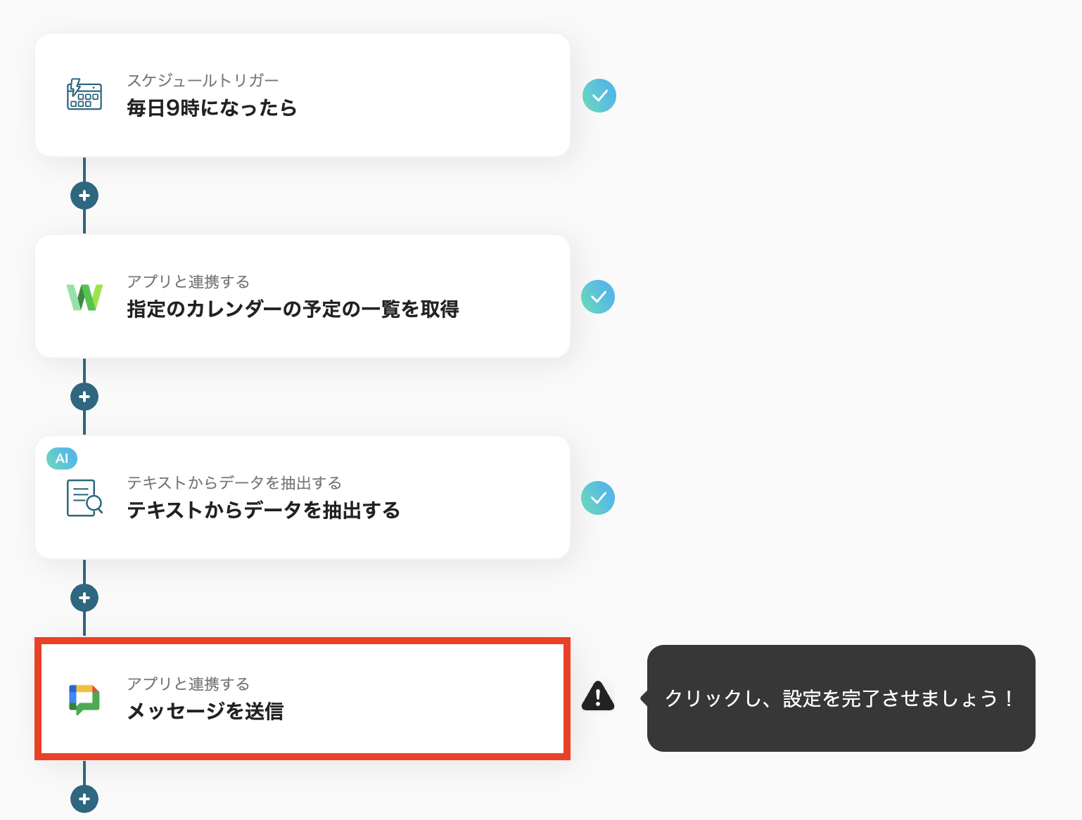 例えば、朝の業務開始前にLINE WORKSに入力された予定を自動的にGoogle Chatで通知させることで、リマインダー機能としても活用できます。