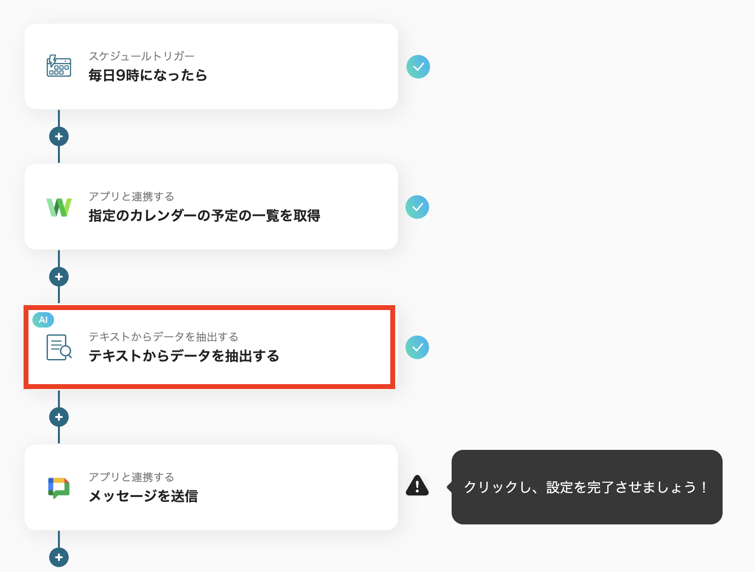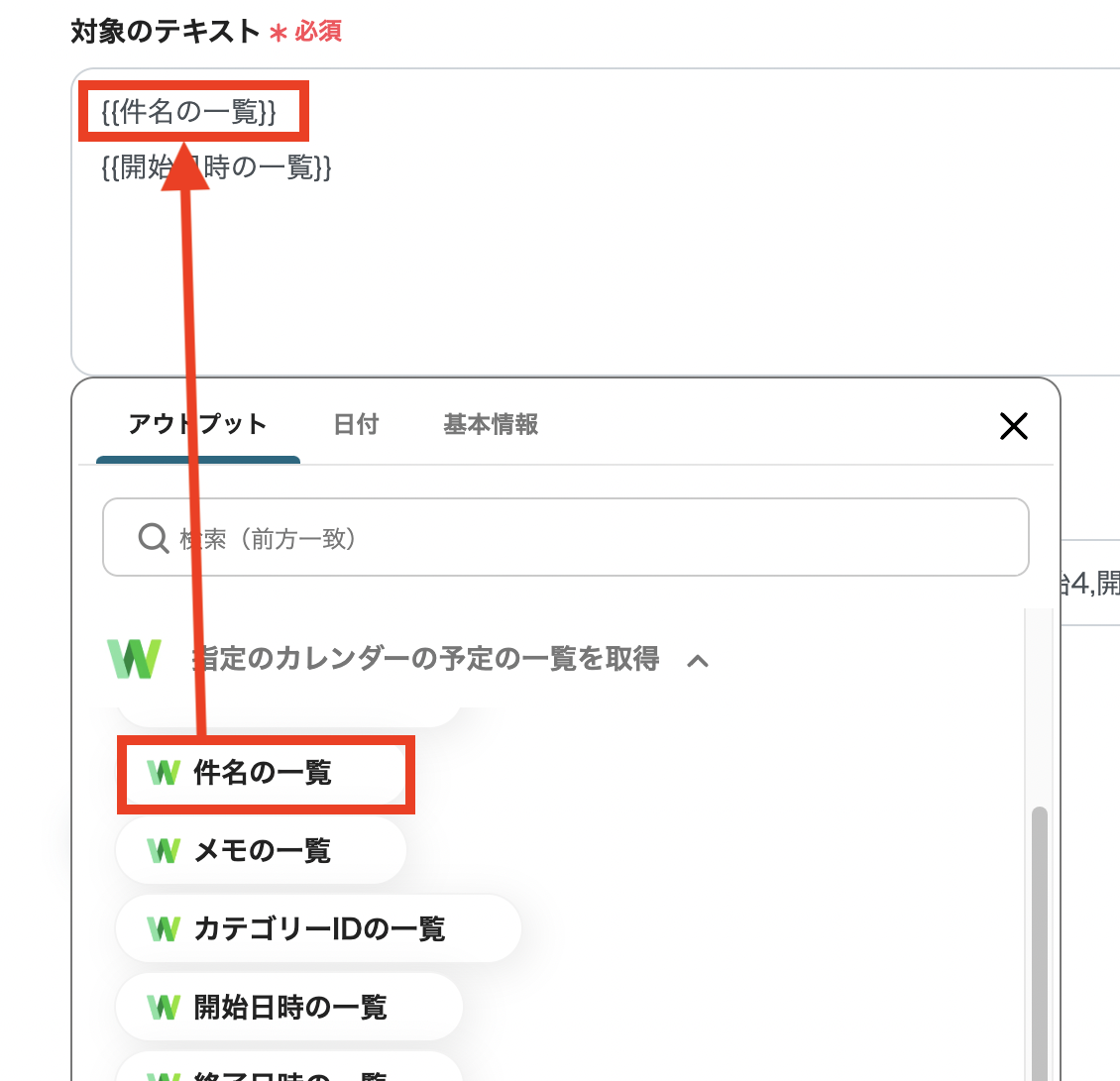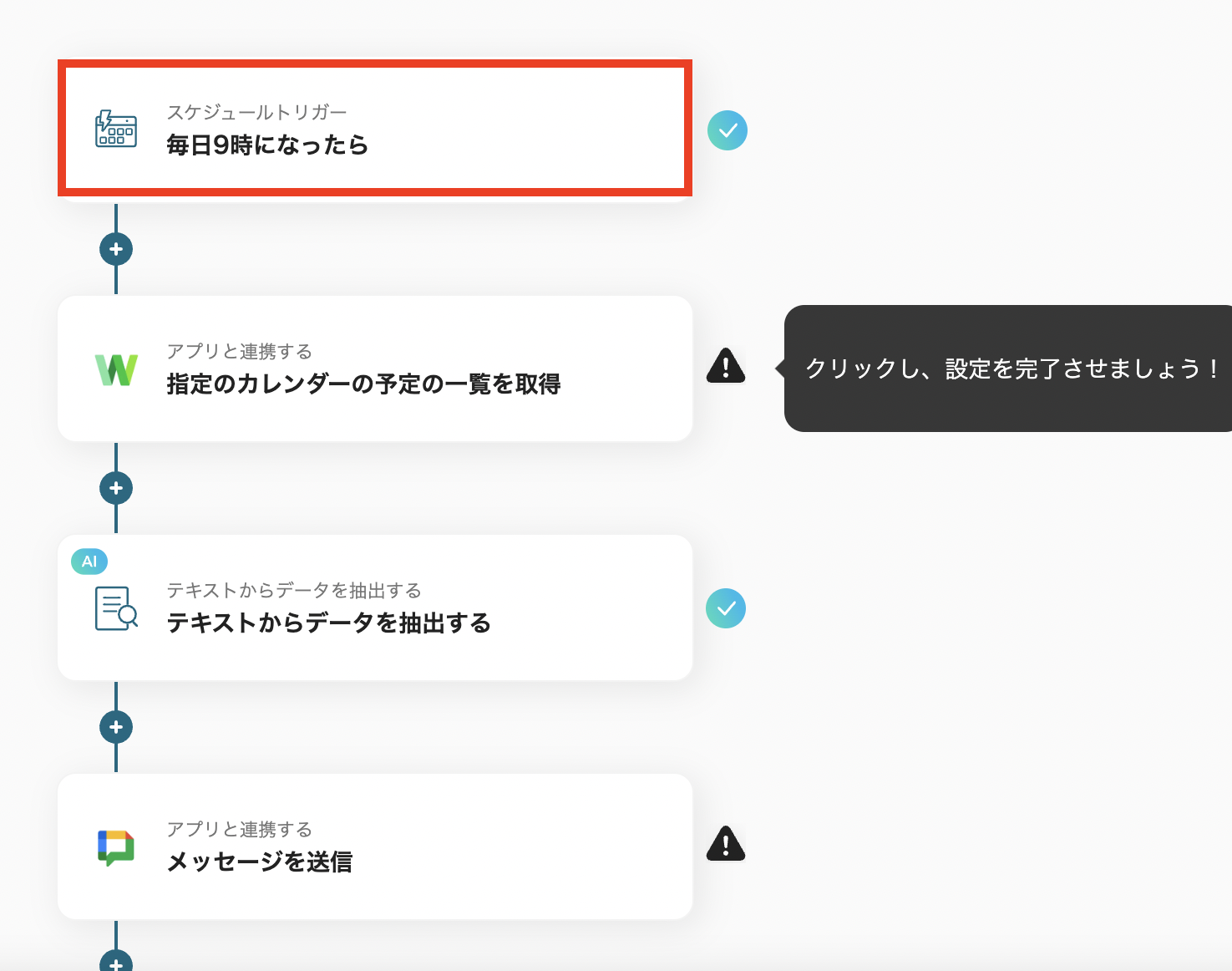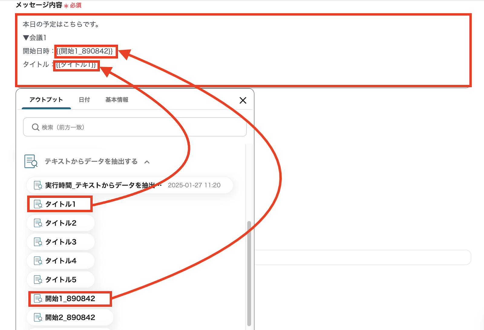 テキストから抽出したデータ(ステップ5)を活用することで、タスクごとのタイトルと開始時間をそれぞれ設定することが可能です。