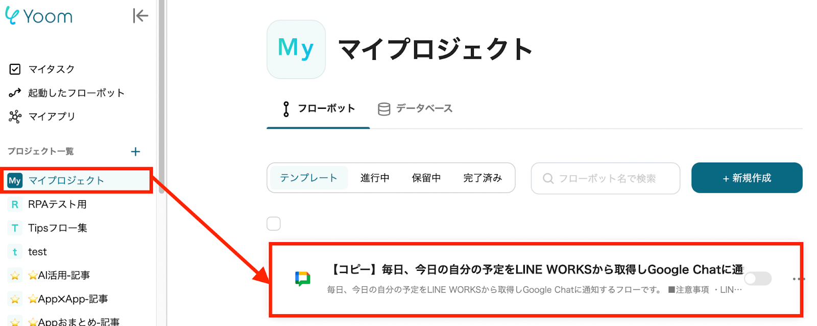 左側にあるメニューの「マイプロジェクト」から、コピーしたテンプレートを開きます。