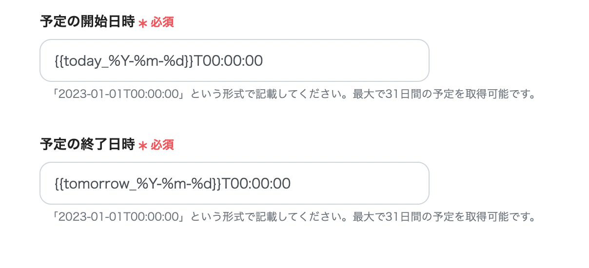 「予定の開始日時」と「予定の終了日時」はすでに入力されています。