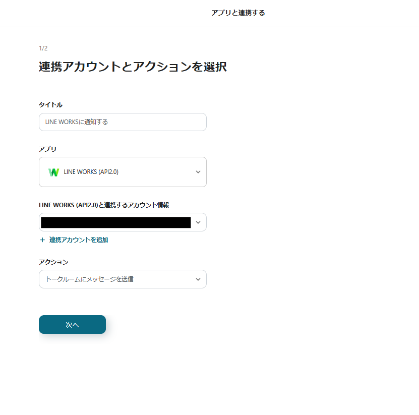 6.アクションは「トークルームにメッセージを送信」を選択して、「次へ」をクリックします。