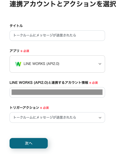 タイトルの任意編集とアカウント情報の確認を行い、アクションは変更せずに「次へ」をクリックして進みます。