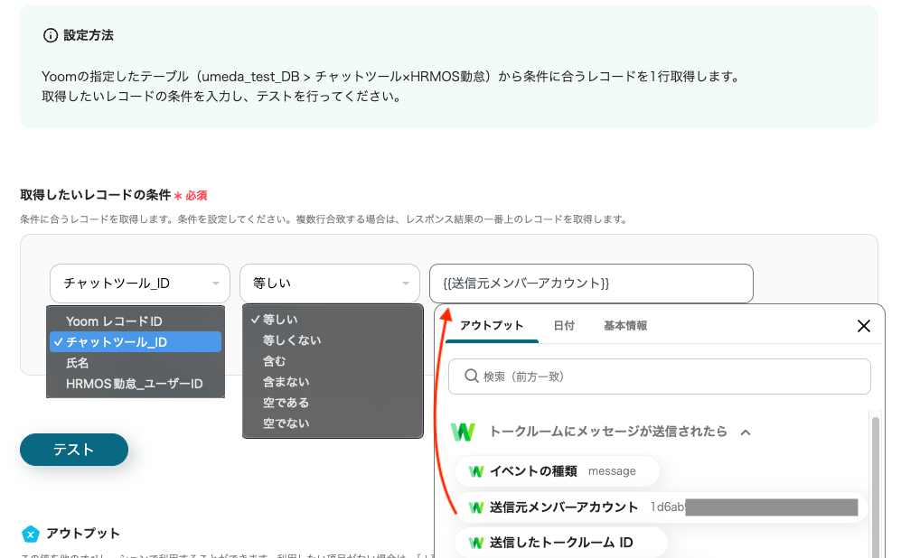今回は画像のように「データベースに保存されているチャットツールIDとメッセージ送信者のIDが一致する」という条件を設定しました。
