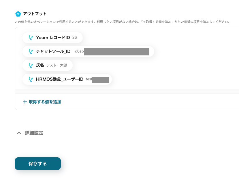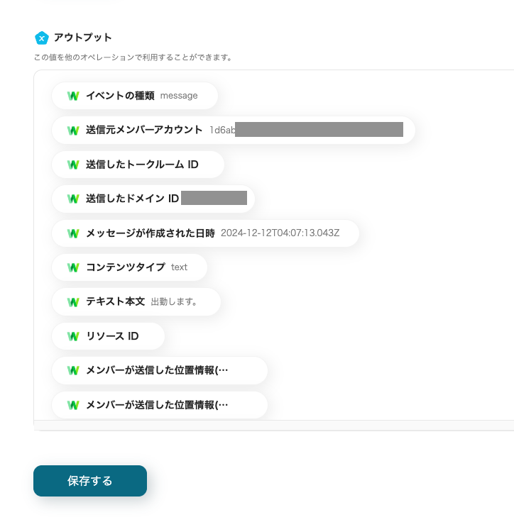 テスト後、「アウトプット」にLINE WORKSから取得した情報が表示されているか確認しましょう。