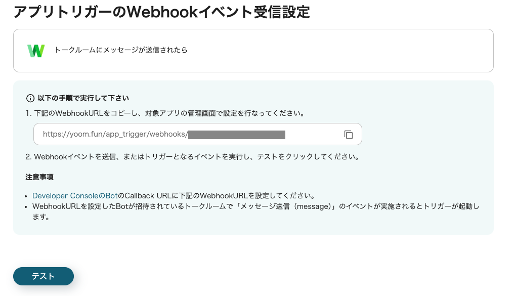 次に、表示されているWebhookURLをコピーし、注釈を参考にしてDeveloper Consoleで設定を行なってください。