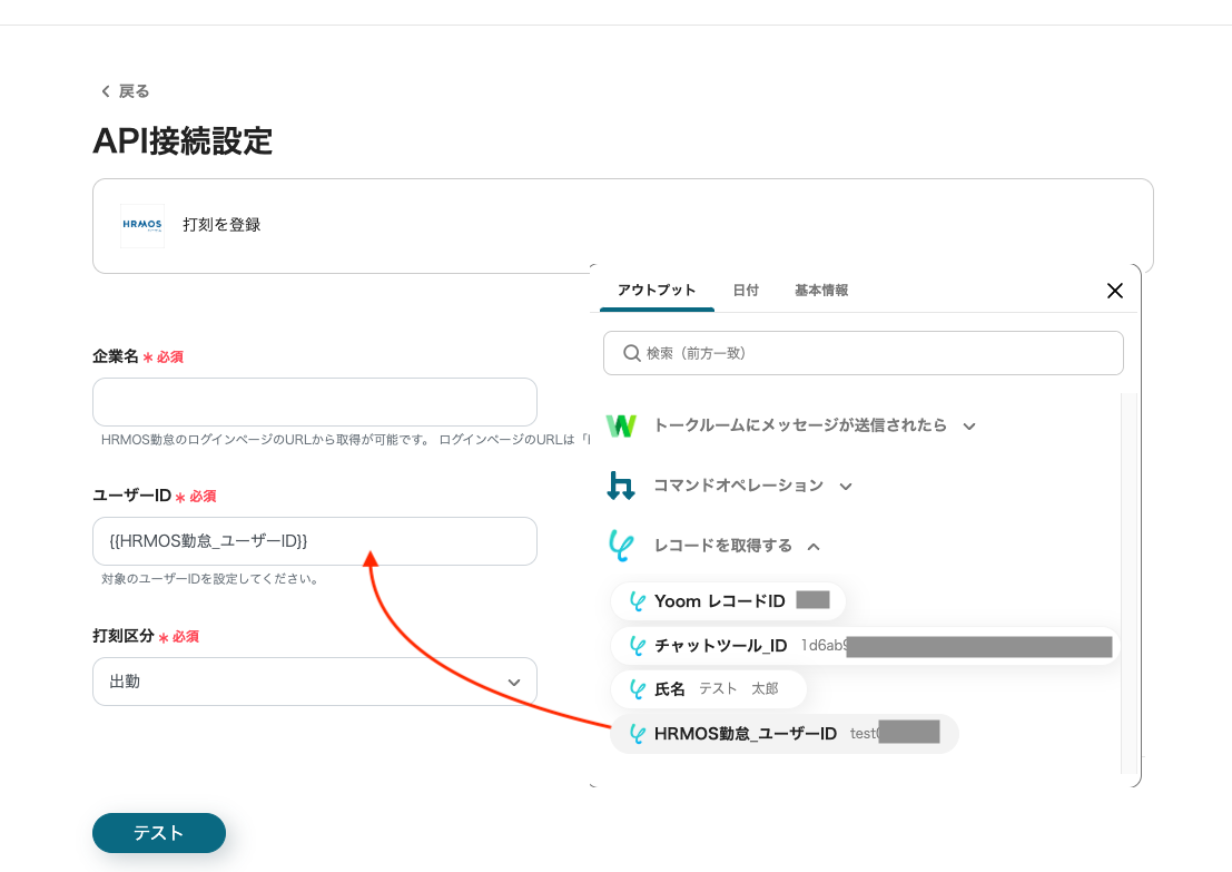 「ユーザーID」は、欄をクリックしてYoomのデータベースから取得したHRMOS勤怠のユーザーIDを選択します。