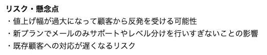 ただし、一部日本語の表現がやや読みにくい箇所も見られました。たとえば「新プランでメールのみサポートやレベル分けを行いすぎないことの影響」という部分は、意味は通じるものの、もう少し整理された表現のほうが読みやすいと感じました。