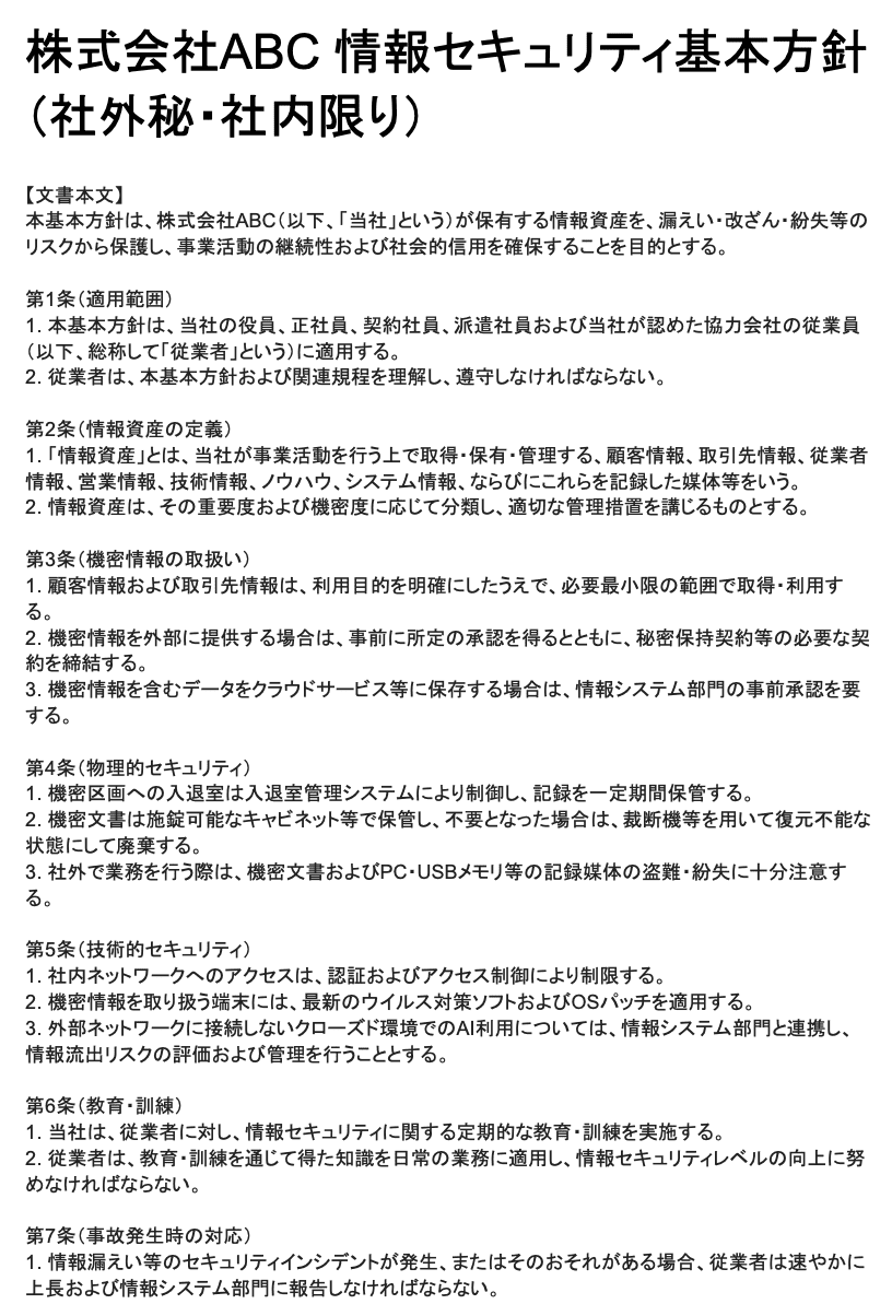 - 文書の「目的」「適用範囲」「情報資産の定義」「機密情報の扱い」「物理的・技術的なセキュリティ対策」「教育・訓練」「事故発生時の対応」の7点を必ず含めてください。
