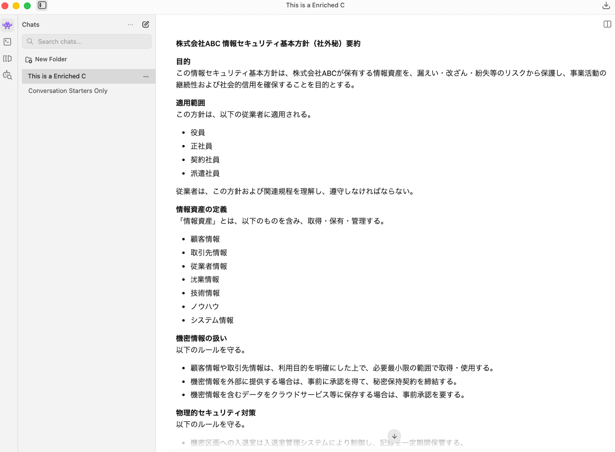Llamaは指示した内容以外にも、関係者以外への開示禁止や印刷物の持ち出し・複写が認められていないことなど、業務上重要な情報を自動的にピックアップして要約していました。この点は評価できるポイントです。