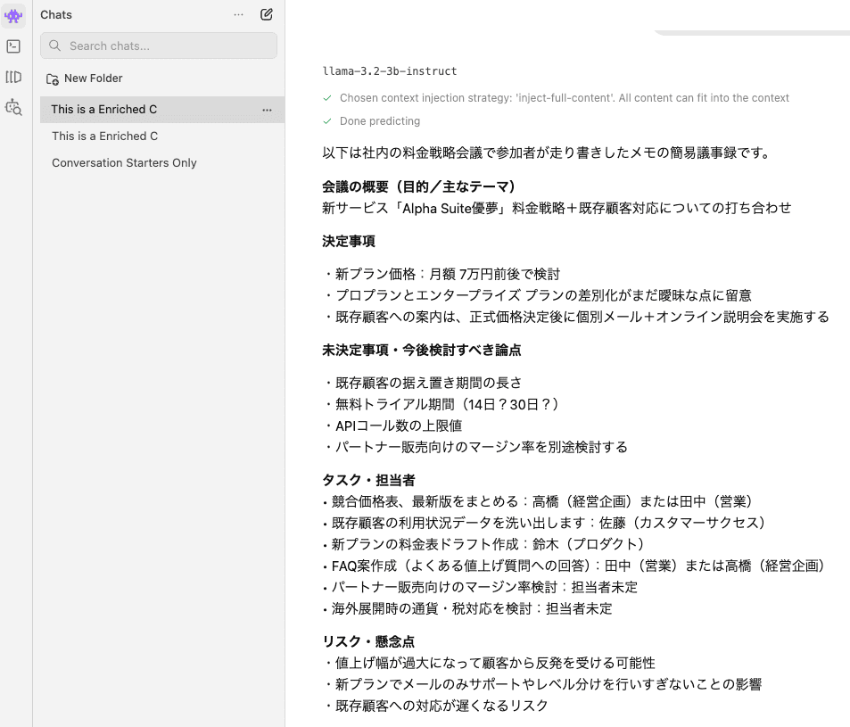 議事録で重要なのは、何が決まって、何がまだ保留なのかを明確にすることですが、Llamaはこの判断を行えていました。断片的であいまいなメモからでも、文脈を理解して適切に分類できる点は、オフライン環境での実務利用において強みです。