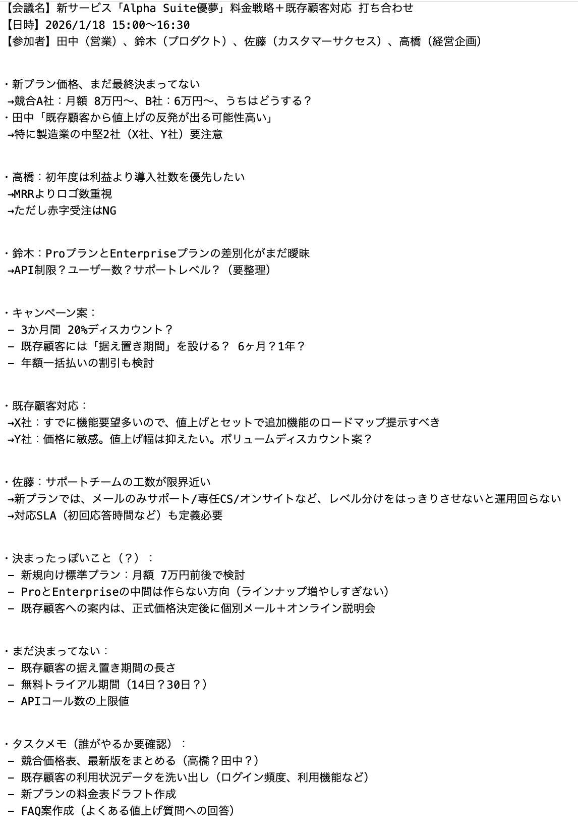 添付のファイルは、社内の料金戦略会議で参加者が走り書きしたメモです。