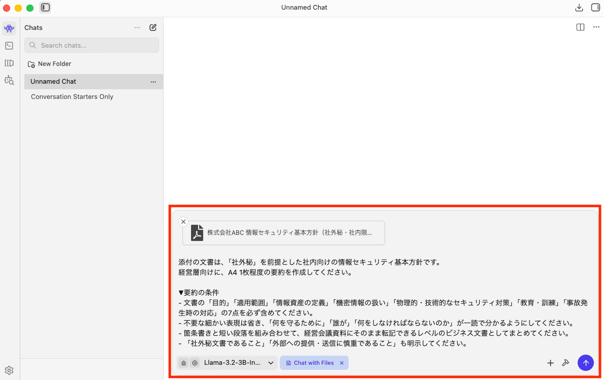 次に、PCをオフラインにして、社外秘の文書とプロンプトを送信します。