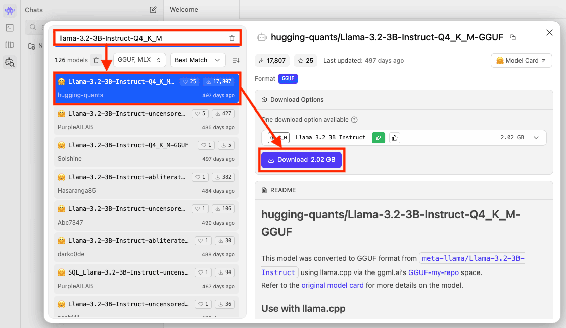 軽量版のLlama-3.2-3B-Instruct-Q4_K_Mを選択し、ダウンロードします。