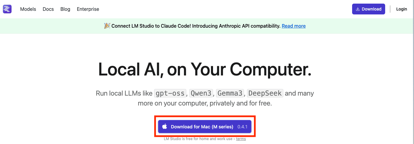 LM Studioを開き、「Download for Mac」をクリックしてインストールします。