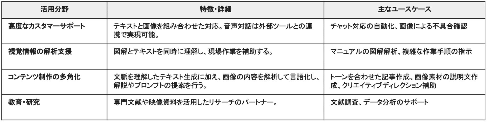 なお、音声対話や動画解析については、外部の音声認識ツールやフレーム抽出技術と組み合わせることで実現可能です。