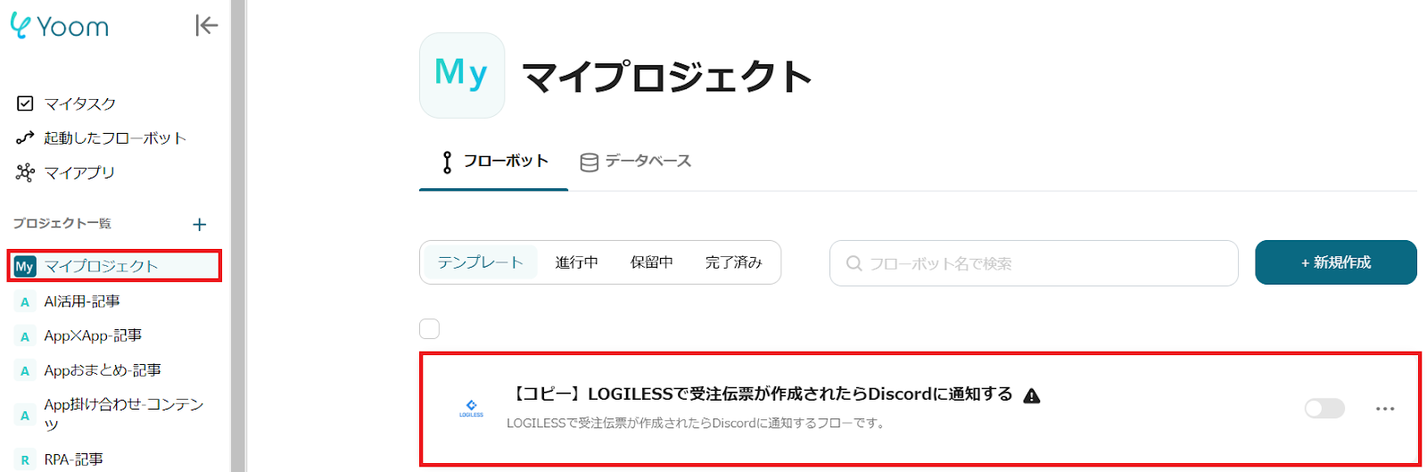 1.Yoom管理画面の「マイプロジェクト」をクリックして、「【コピー】LOGILESSで受注伝票が作成されたらDiscordに通知する」をクリックします。