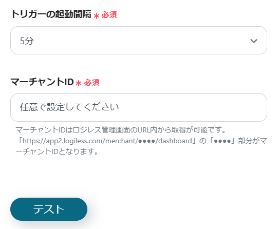 4.トリガーの起動間隔、マーチャントIDを設定し、テストをします。