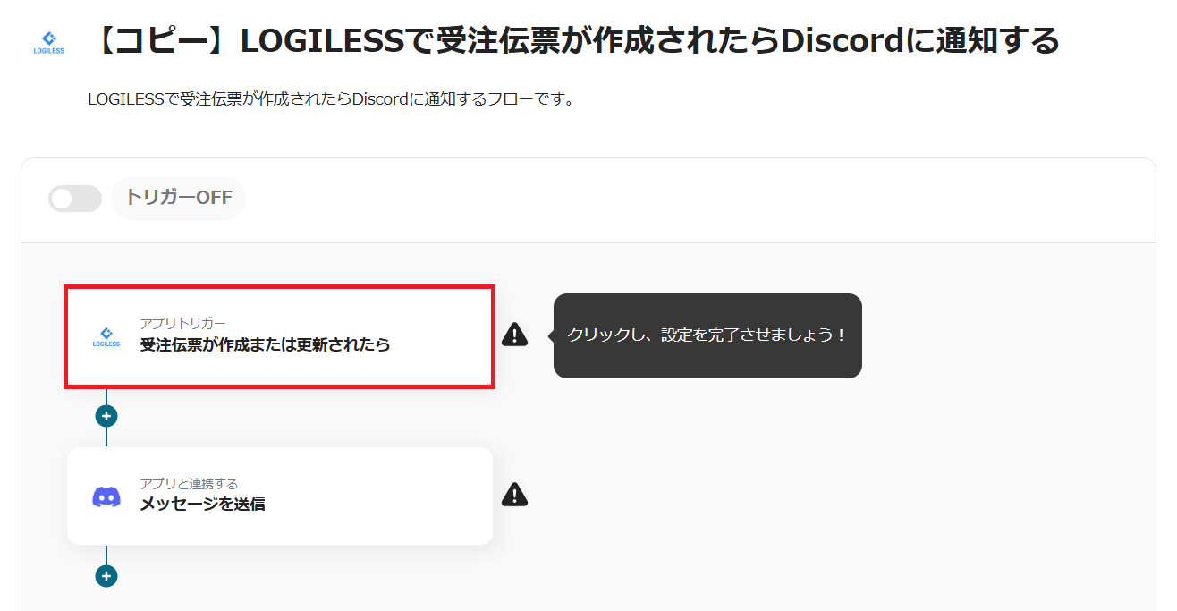 ・フローの起点となるLOGILESSのトリガー設定と、その後に続くDiscordの通知設定