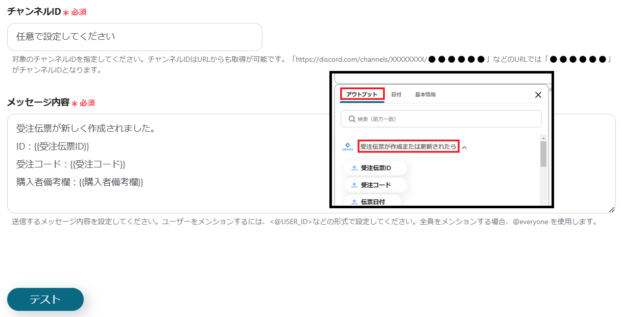 ※メッセージ内容は、枠をクリックすると表示されるアウトプットの「受注伝票が作成または更新されたら」から、必要な項目を入力します。このLOGILESSから取得したアウトプットの項目を利用すれば、受注伝票ごとに変わる値を動的に反映できます。またメッセージ内容には、定型文を直接入力することもできます。
