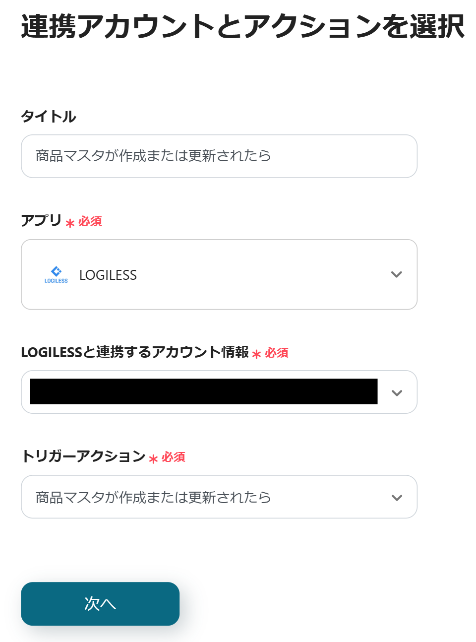 LOGILESSの設定を行うため、「商品マスタが作成または更新されたら」をクリックします。