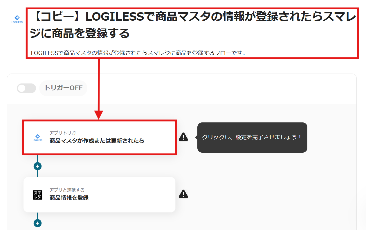 1.スマレジで商品情報が登録されたら、LOGILESSに商品マスタを自動登録するフローです。
