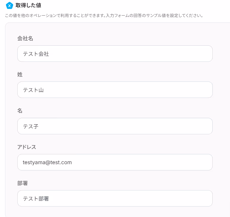 確認できたらプレビューページを閉じ、「取得した値」にそれぞれの項目をテスト回答として入力してください。